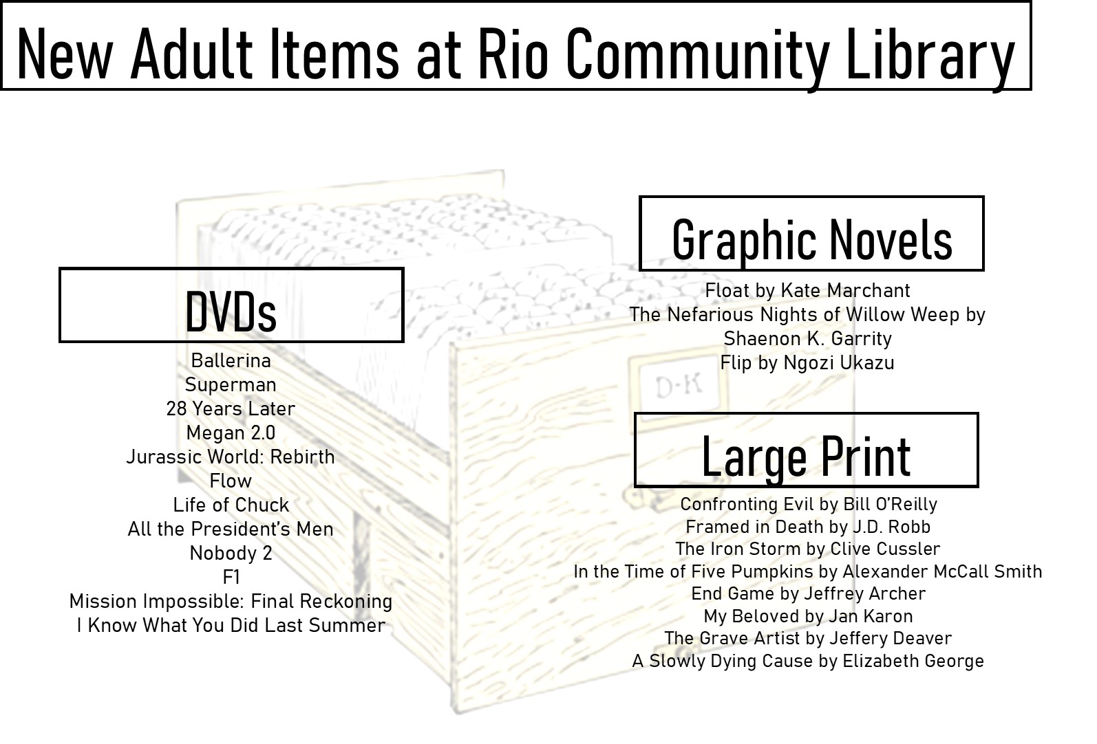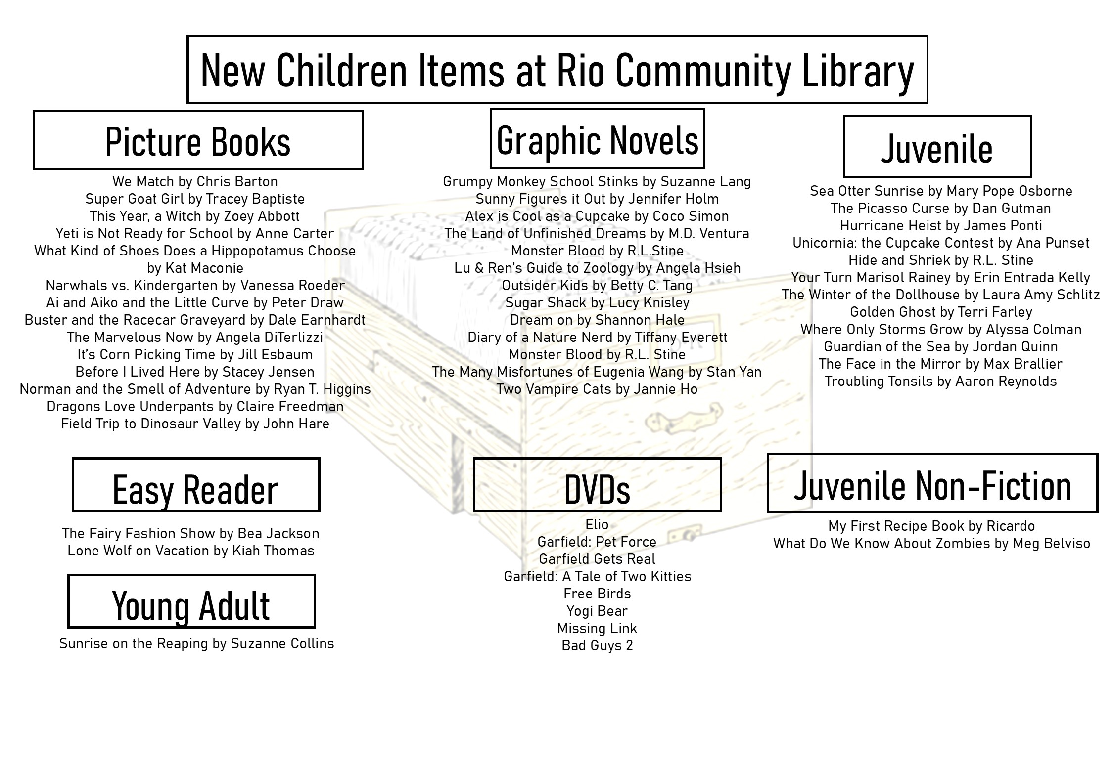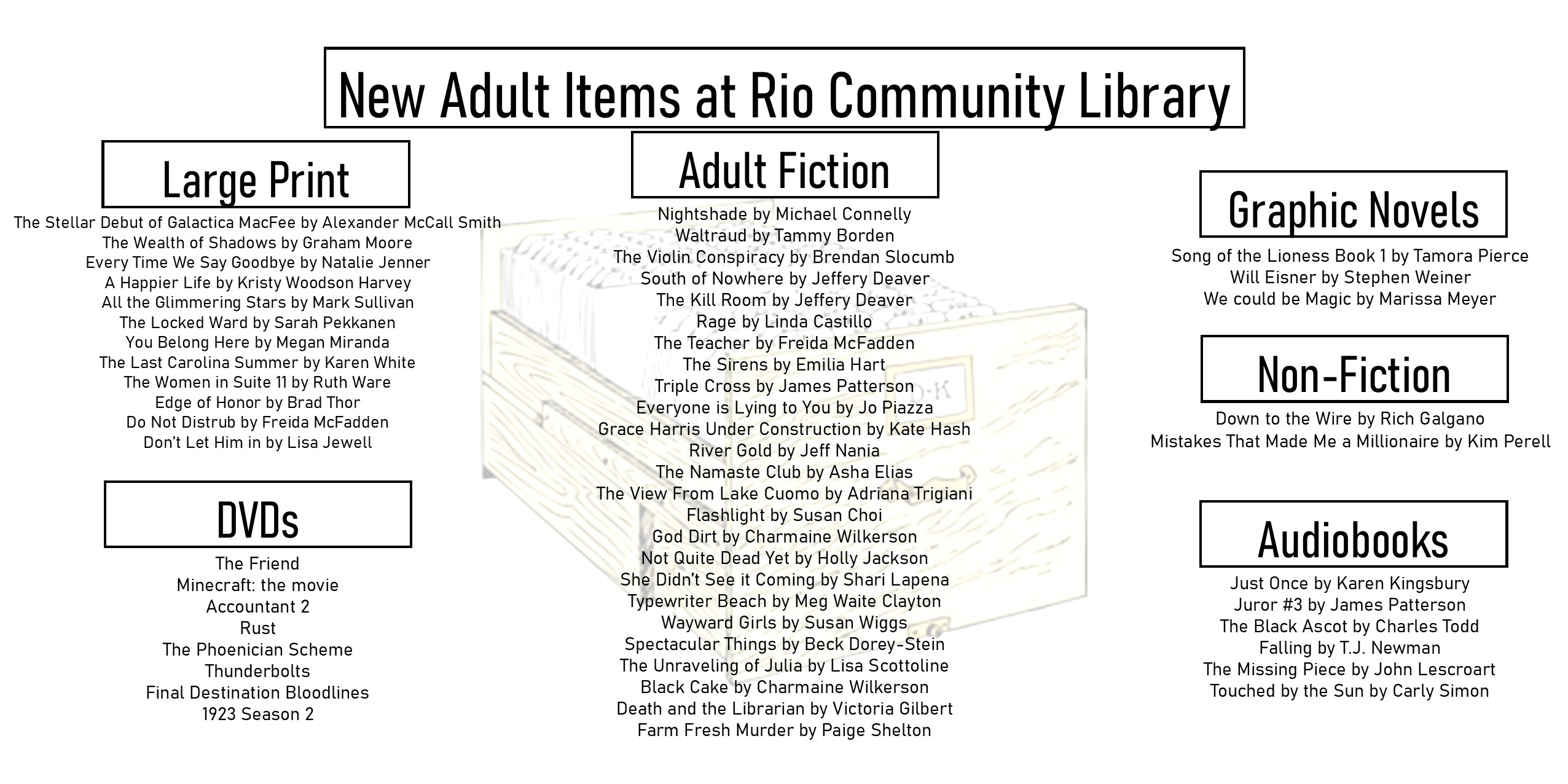 Click on the links below to see what is new at the library.  We have separated them by the month they were catalogued.  If you would like to be put on reserve for any of these titles, just give us a call or email and we will be happy to do that for you.