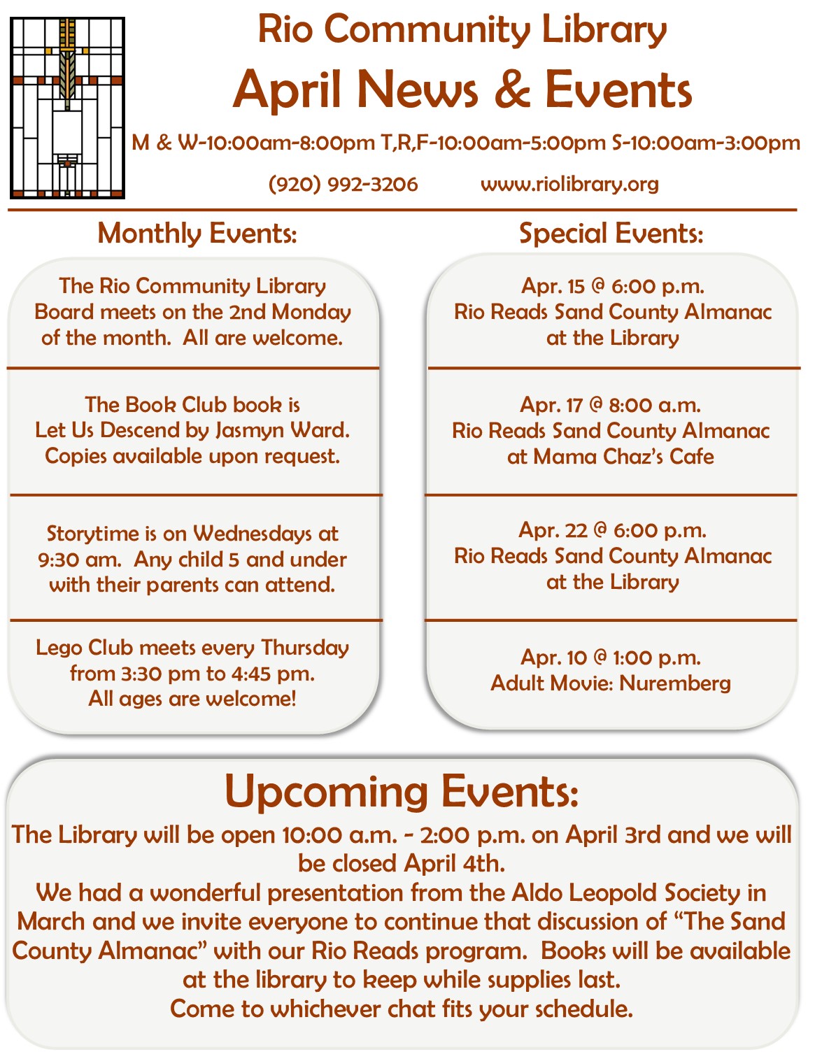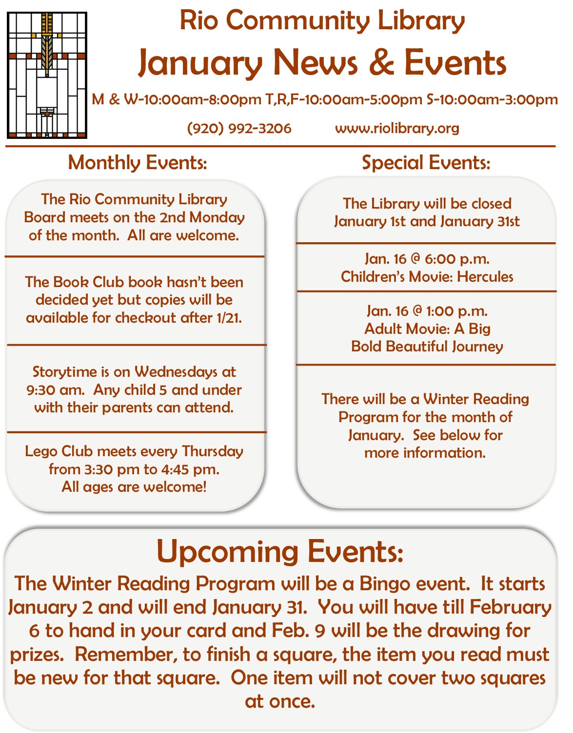 Through June and July, we have a Summer Reading Program for Children and Adult participants. Everyone keeps track of their reading in booklets and when certain levels have been met, a small prize and 4 tickets for bigger prizes are awarded. The bigger prizes have an empty box with a picture of the prize next to it. Participants are encouraged to put as many of their tickets in as many prize boxes that they are interested in winning. The drawing for the prizes will be held after the reading period ends. We also have several performers and activities scheduled that we hope will bring fun and entertainment to our community. More information can be found on our webpage: https://www.riolibrary.org/oceans-possibilites-info